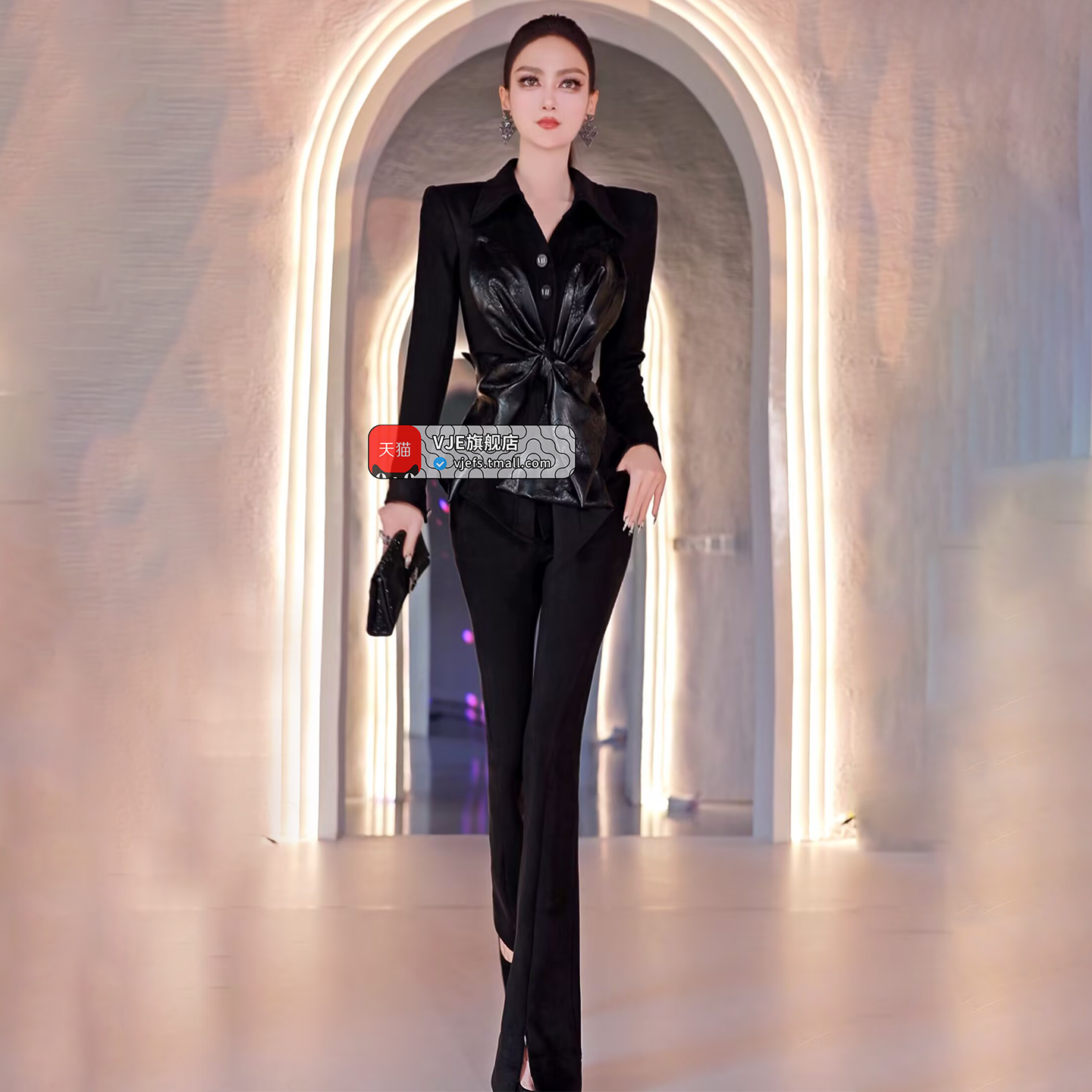 VJE Flower Top Flared Pants Two-Piece Splicing Set-SAXS.