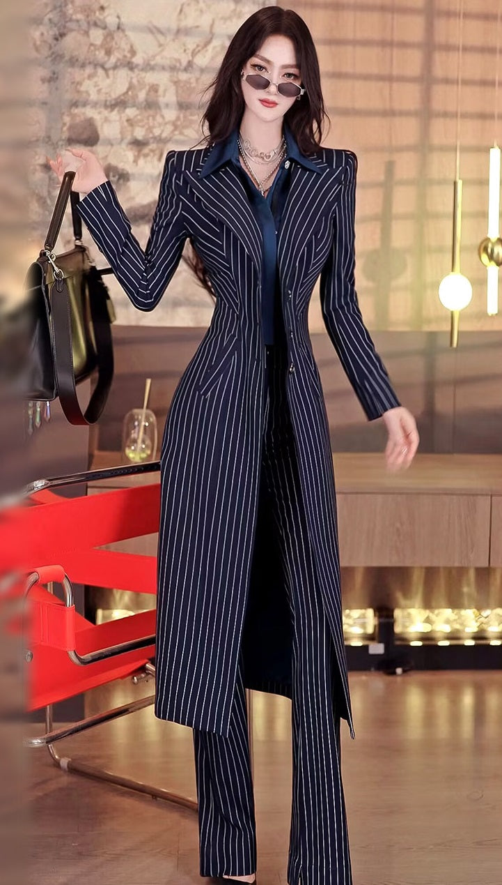 Elevate your wardrobe with this striking two-piece ensemble featuring a tailored striped trench coat paired with flared pants. The structured coat showcases classic pinstripe detailing and a refined silhouette, while the complementary flared pants create an effortlessly chic line. Perfect for transitional seasons, this set delivers polished sophistication whether styled together or mixed with existing pieces. The quality construction ensures lasting wear, making it an investment piece that transcends seasonal trends. Ideal for the modern woman who values both style and versatility.