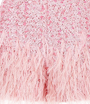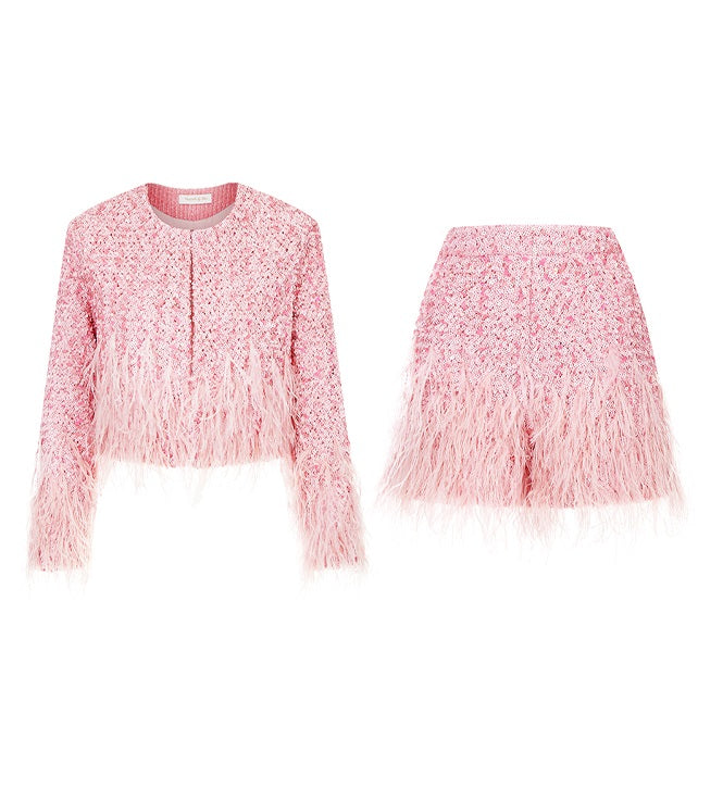 Wardrobes By Chen Elegant feather Pink Round Neck Long Sleeve Jacket /Shorts-Hera