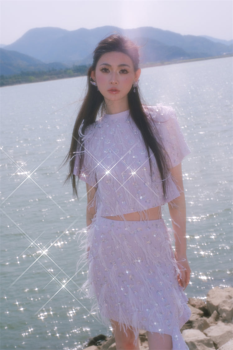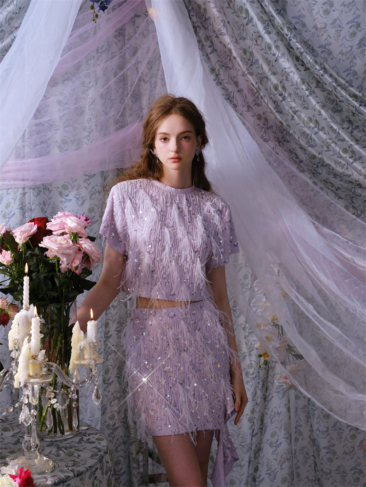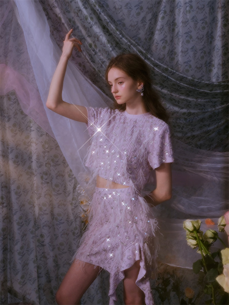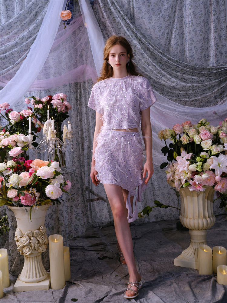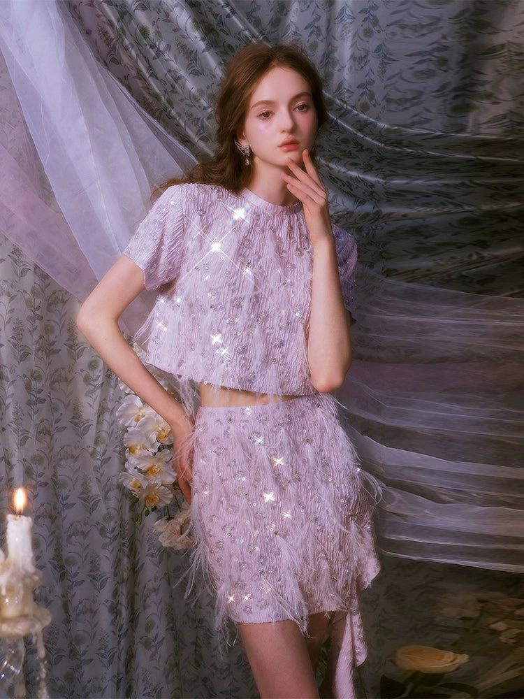 Wardrobes by Chen Elegant Short Sleeve Diamond Feather Top/Short Skirt- Milo