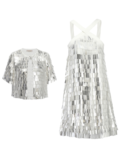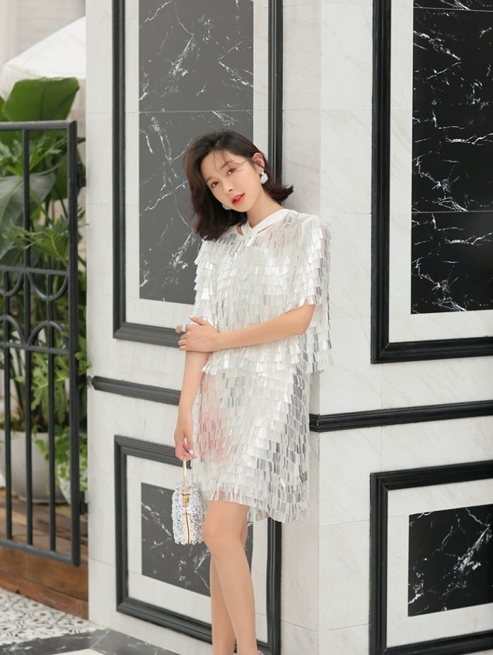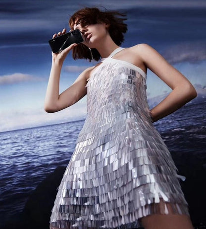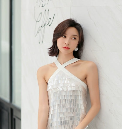 The sleeveless design exudes ultimate sexiness, perfect for any party. The sparkling sequin detail adds a touch of luxury, making you the center of attention. Be effortlessly alluring and chic in this exclusive piece.