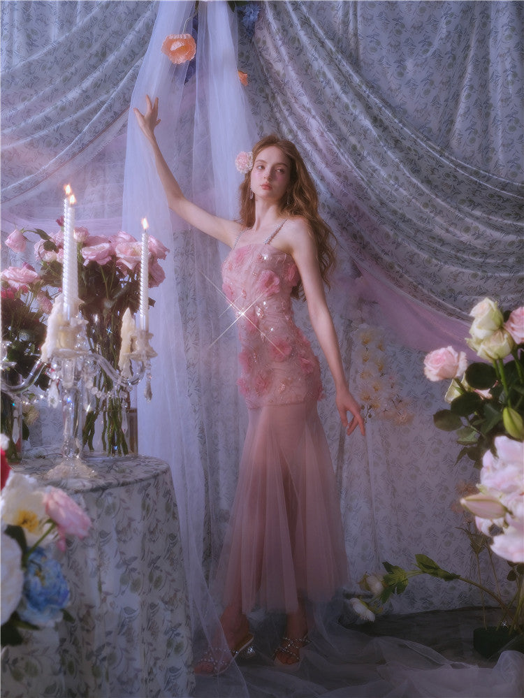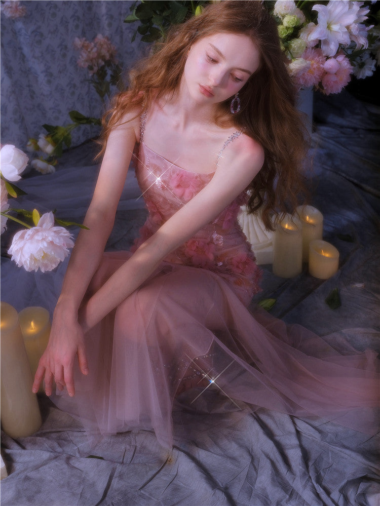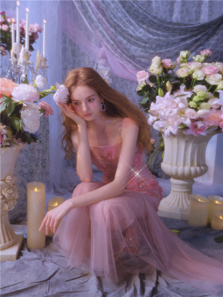 Wardrobes by Chen High End Pink Sleeveless Flower applique Sequin Dress-Bena