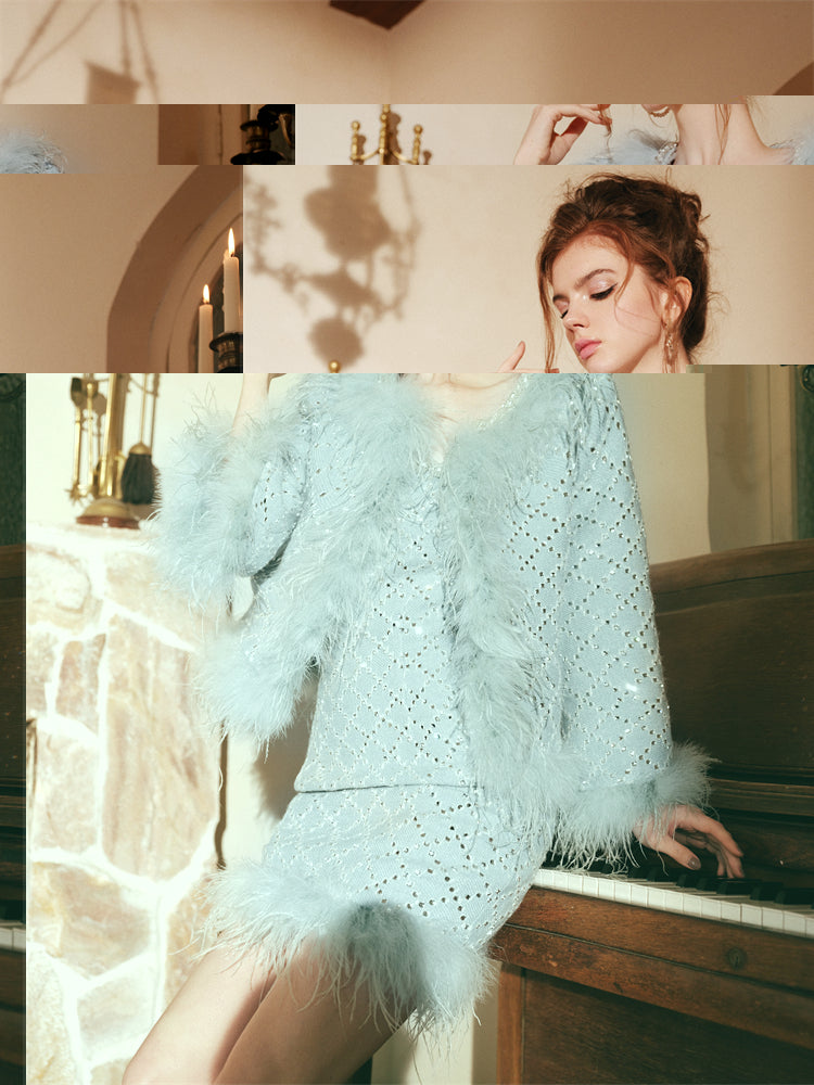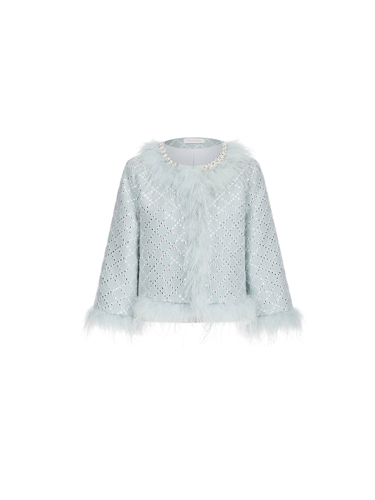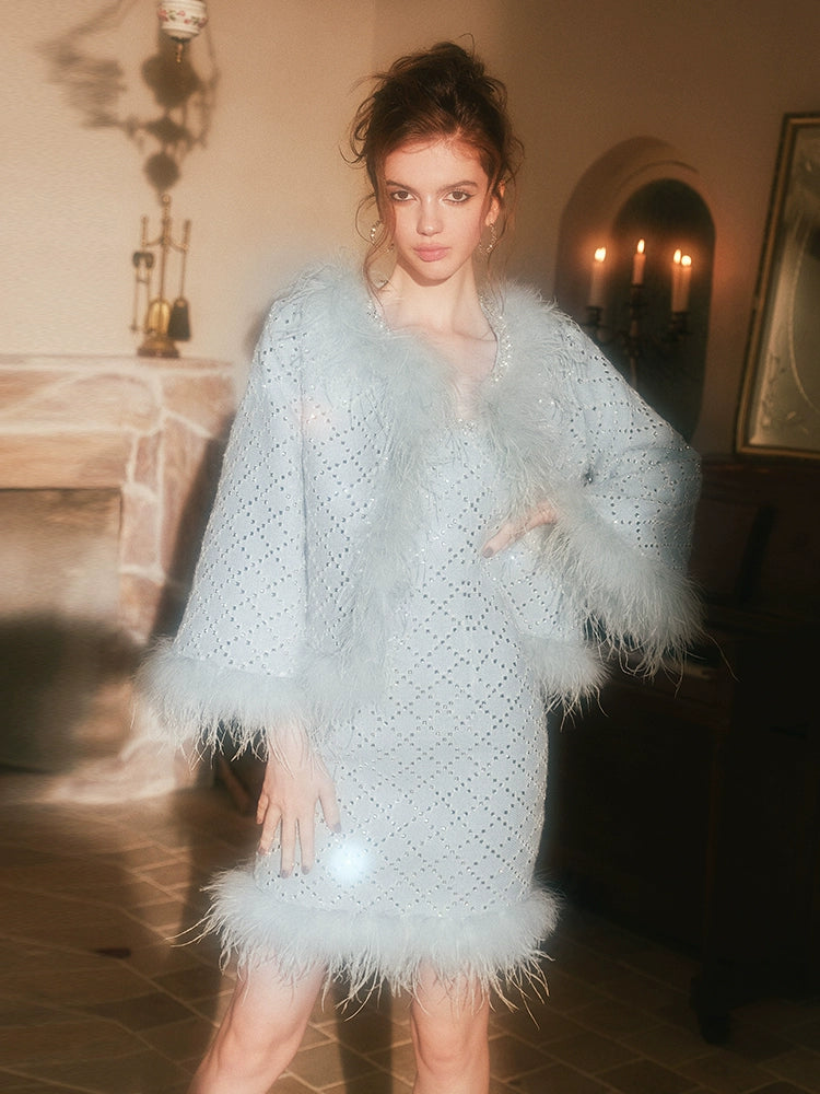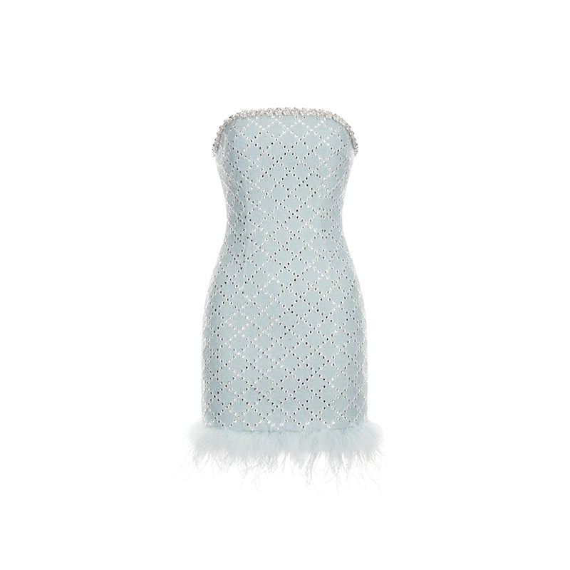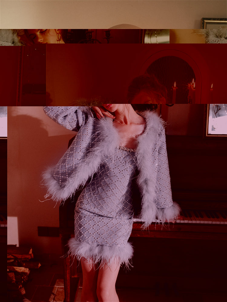 Indulge in luxury with Wardrobe by Chen's exquisite long sleeve diamond feather jacket/strapless dress in fiery red. Exude elegance and sophistication with its chic and classy design. A must-have for any stylish fashionista, this wardrobe staple seamlessly combines style and versatility for a timeless and exclusive look.