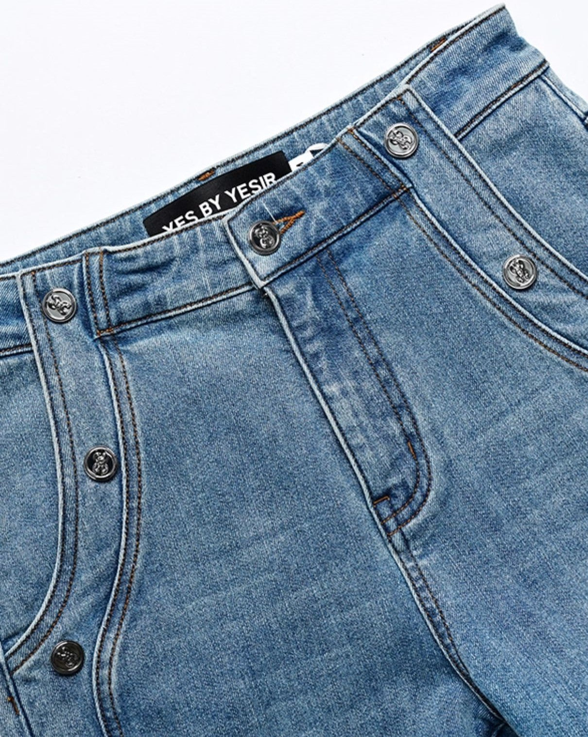 The YES BY YESIR New Ye Qian Original Designer Six-Button Horseshoe Bootcut Jeans offers a refined silhouette with classic bootcut styling. Featuring a distinctive six-button front and elegant horseshoe detailing, these jeans blend timeless craftsmanship with modern design. Crafted for both comfort and a tailored fit, they provide a polished yet effortlessly chic look ideal for elevating any wardrobe.