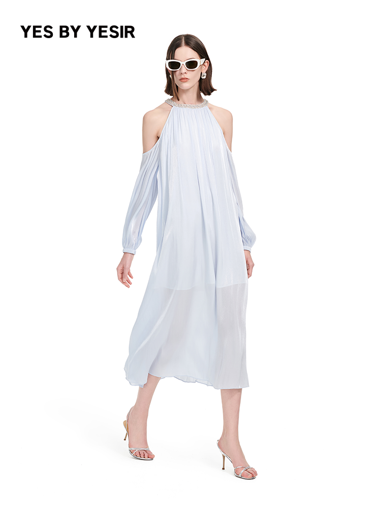 Experience refined elegance with the YES BY YESIR | Ye Qians 2025 Glacier Radiance Off-Shoulder Streamer Gauze Skirt. Crafted in a delicate icy blue, this piece features a flowing gauze skirt complemented by luxurious diamond detailing. Its off-shoulder design adds a sophisticated touch, perfect for making a striking impression at any upscale event. The combination of airy fabric and sparkling accents enhances both comfort and visual appeal, embodying timeless grace with a modern edge.