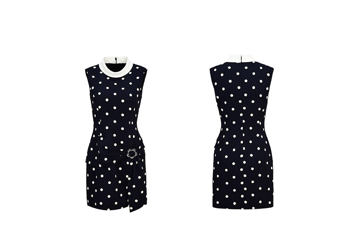 YES BY YESIR | Ye Qian Polka Dot Print Sleeveless Dress with Loop Knot & Deconstructed Charm-GENEVA.