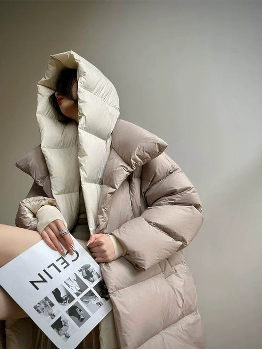 Aconiconi Luxury Duck Down Loose Beige Long Winter Jacket Coat- Almond Croissant