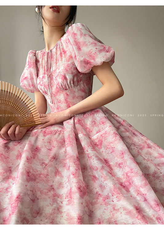 Aconiconi Luxury French Retro Printed Square Collar Summer Dress- Dusk Clouds Flowers