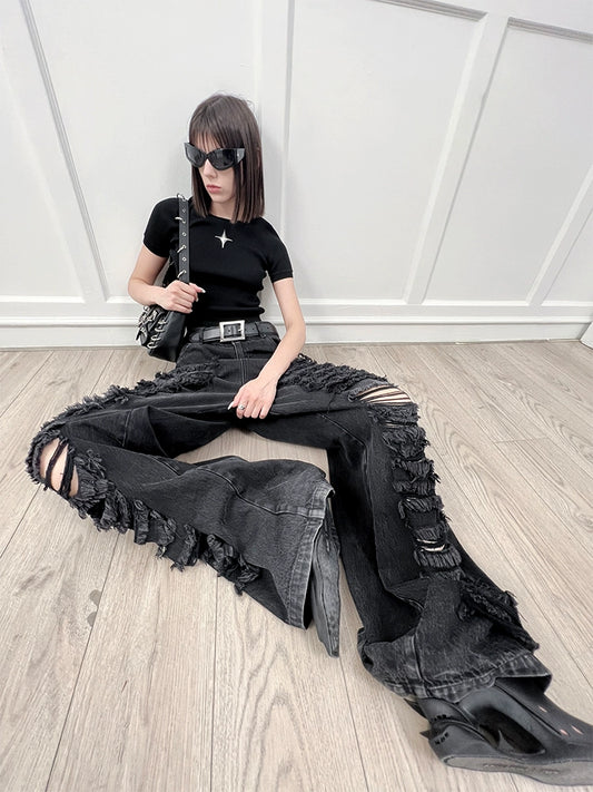 ANNAKIKI Designer Women's Niche Black Ripped Distressed Jeans Wide-leg Pants-SPIKE