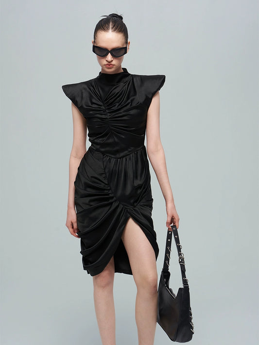 ANNAKIK black acetic multi-pleated three-dimensional flying sleeve dress-SHIGAKI