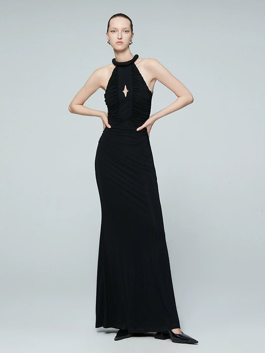 ANNAKIKI black four-pointed star hollow pleated halterneck dress-GICHII