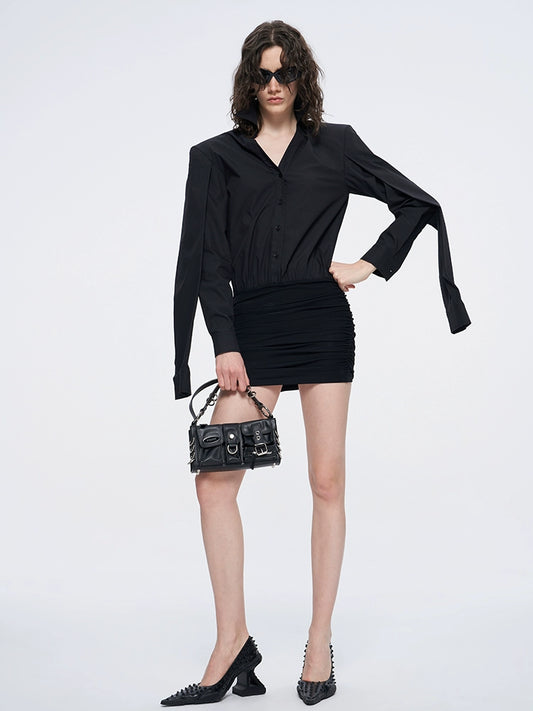 ANNAKIKI Black shoulder pleated slit long sleeve women bodysuit tops-REN