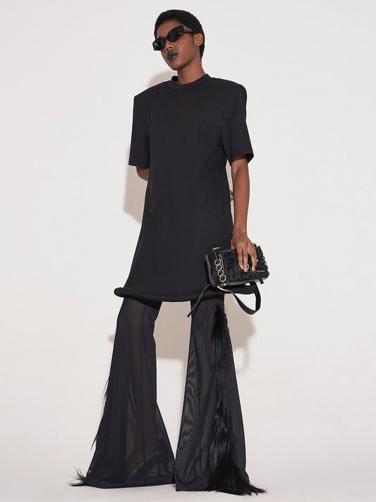 ANNAKIKI Black Saucer Hem Shoulder Padded Loose Dress-SHIRA