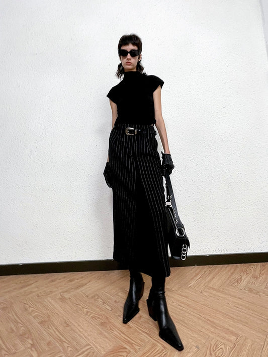 ANNAKIKI Black and White Striped Vintage Belt Trim Striped Skirt-RAVY