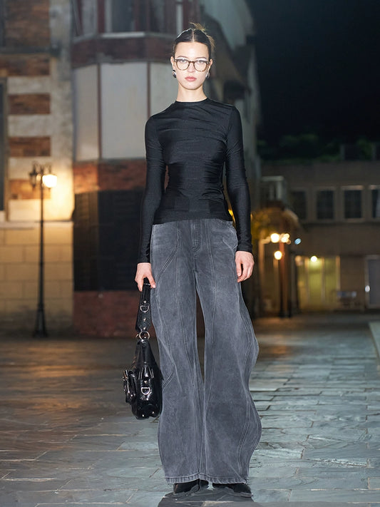 ANNAKIKI Black Structure Stitched Loose Long Sleeve Top-MUNI