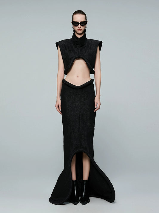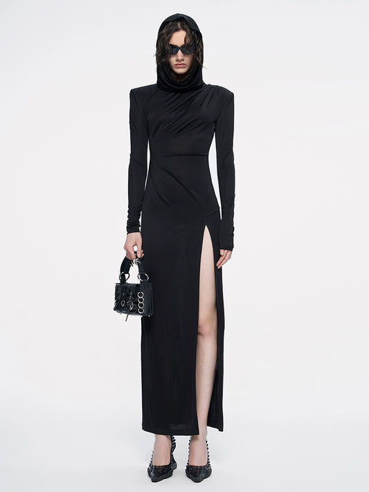 ANNAKIKI Designer Black Acetate Hood Slit Long Skirt Dress-HARUNA