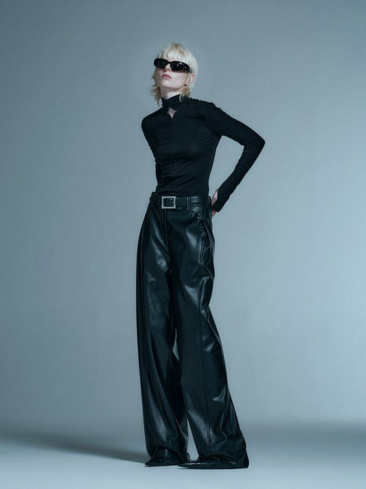 ANNAKIKI Designer Black Buckle Slim Fit Wide-Leg Casual Boot Pants-SAKATA