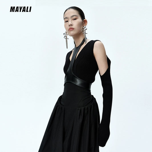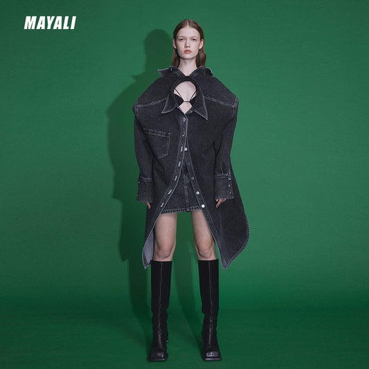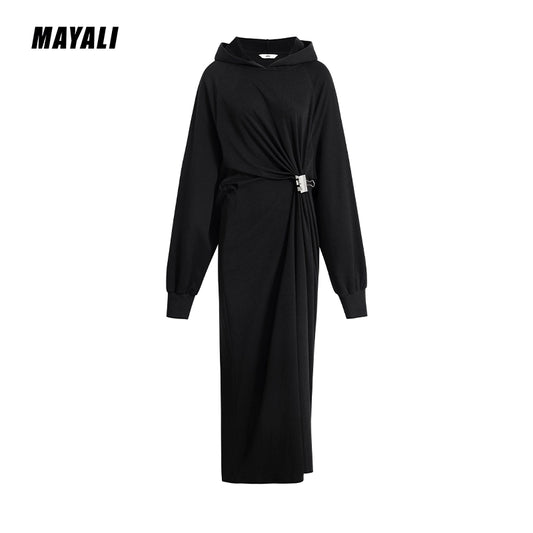 MAYALI hooded pinched waist luxury autumn minimalist black dress - SikIma