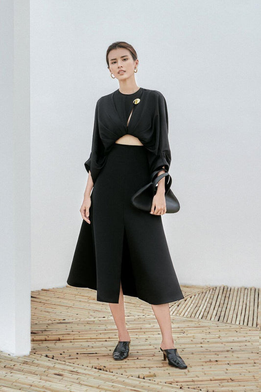 Designer Round neck pleated drape hollow short classy top blouse Skirt suit set - Harmony