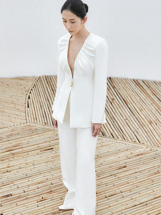 Designer tailored low V-neck buckle split long-sleeved trousers high fashion white wedding pant suit - Kayla