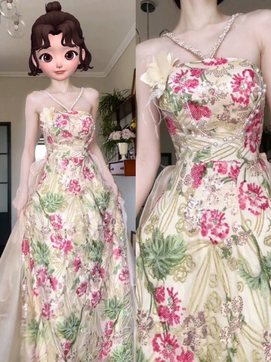 DOLLY Elegant Flower Print Sleeveless Sequin Embroidered Long Halter Neck Dress-DOMMA (V)