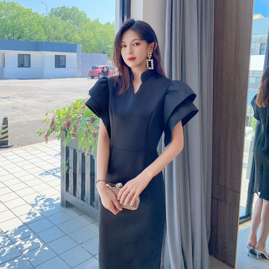 DOLLY Elegant French Style Black Stand Collar Short Sleeve Office Dress-MAMA
