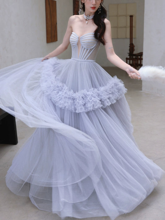 DOLLY Elegant Fog Blue Retro Sleeveless Bandeau High Waist Tutu Dress- (V)