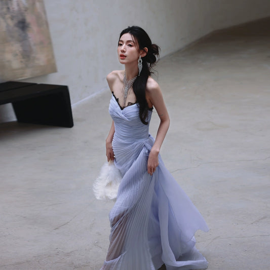 DOLLY Elegant Light Purple Greek Style Sleeveless Bandage Pleated Long Dress-Fog