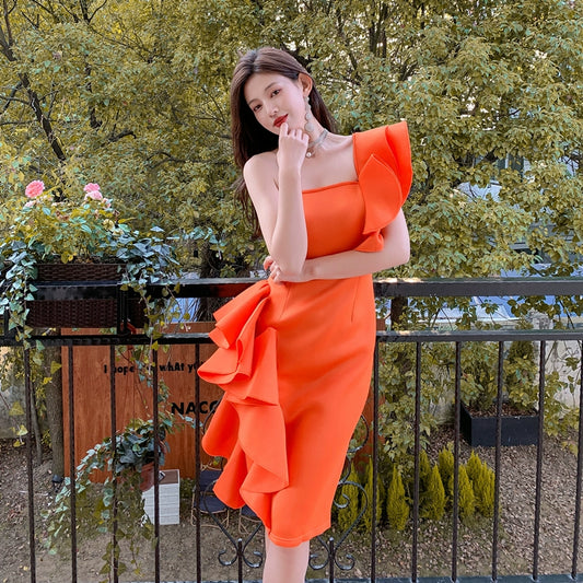 DOLLY Elegant Off Shoulder Ruffle Slim Fit Midi Wedding Guest Dress-JADE