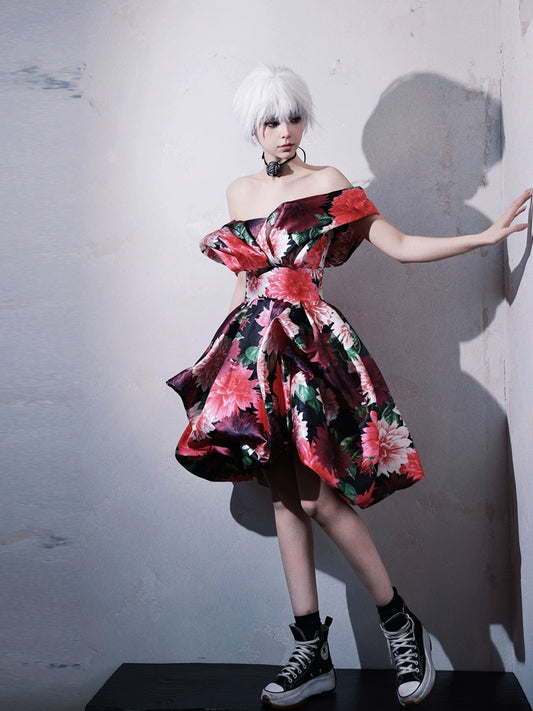 DOLLY Elegant Off Shoulder Flower Print Ruffle Short Sleeve High Waist Dress-CINDY (V)