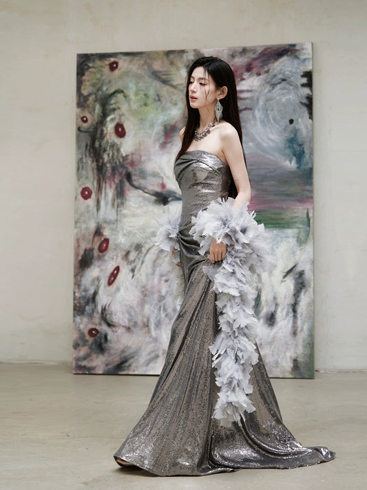 DOLLY Elegant Metallic Gray Skin Revealing Tube Top Long Dinner Dress-NIKITA (V)