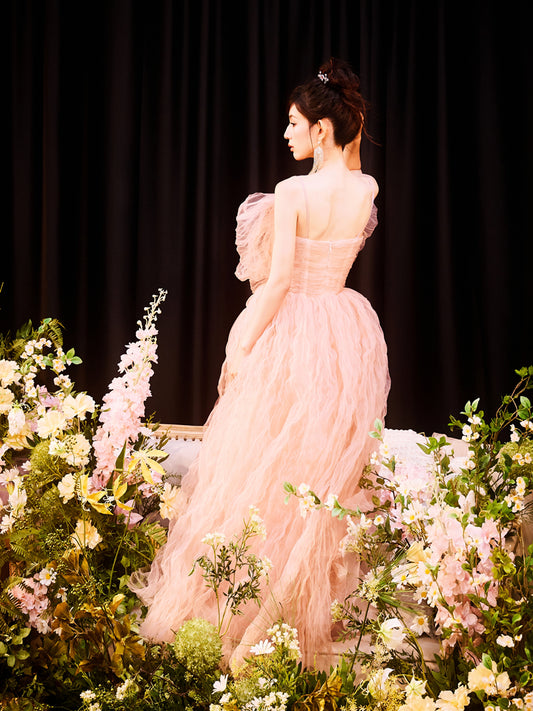 DOLLY Elegant Pink Ruffle Backless Sleeveless Long Halter Neck Banquet Dress-SHANTEL