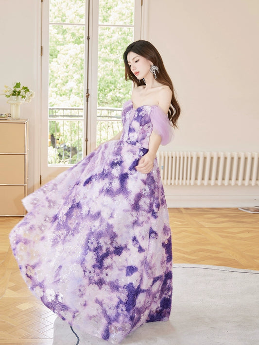 DOLLY Elegant Purple Off Shoulder Short Sleeve Print Long Loose Dress-ABUELA (V)