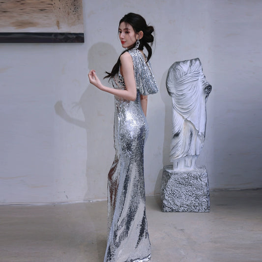 DOLLY Elegant Sliver V-Neck Sleeveless Slim Fit Long Party Dress-ZERA
