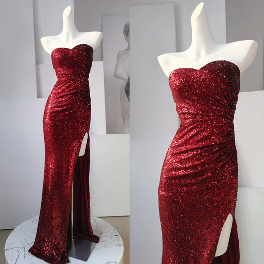 DOLLY Elegant Sparkling Diamond Tube Top Slim Fit Long Slit Cocktail Dress-GIRLE