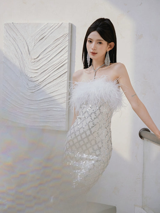 DOLLY High End Sexy Feather Bandeau Slim Fit Hip Hug Dinner Dress-Sliva
