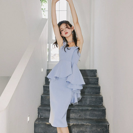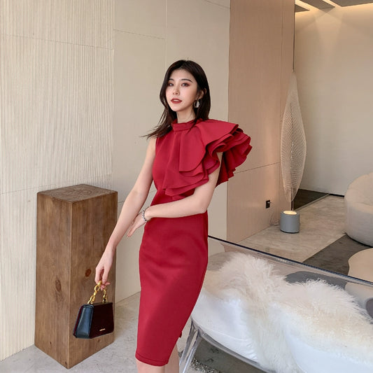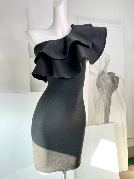 DOLLY High End Slant Collar Ruffled Of Shoulder Body Hug Short Formal Dress-ZENAIDA