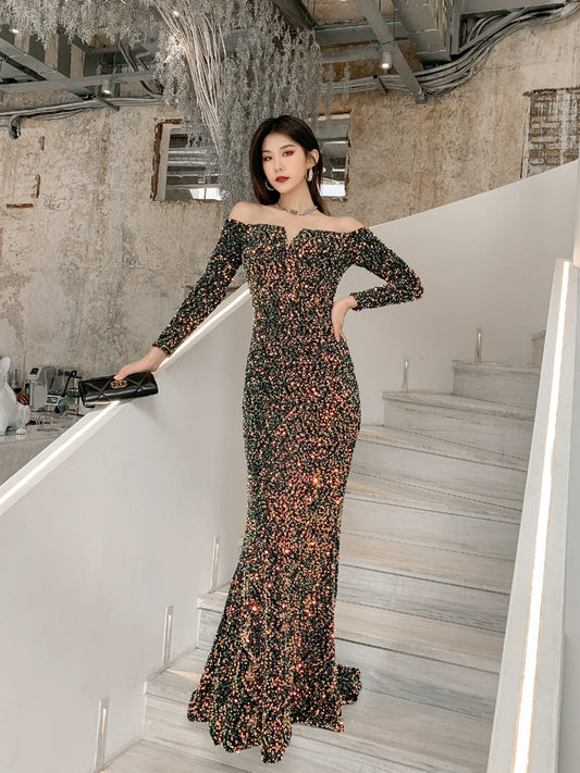 DOLLY High End Sequin Off Shoulder Long Sleeve Slim Fit Long Fish Tail Evening Dress-KASSIE