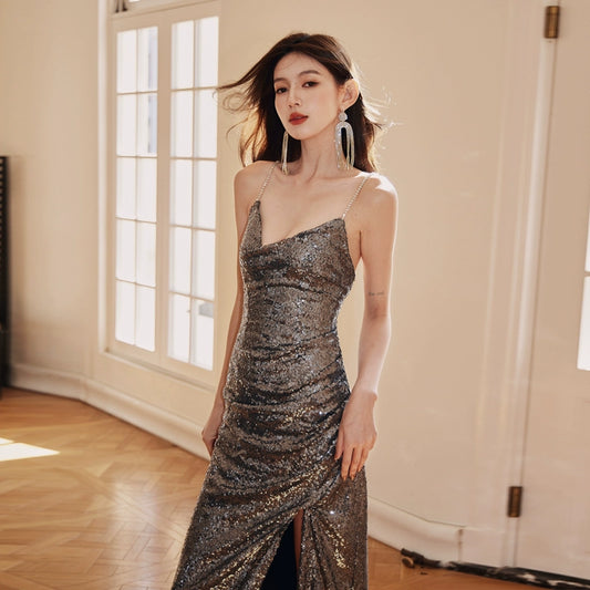 DOLLY High End Sleeveless Beaded Sequin Long High waist Suspender Cocktail Dress-ANABEL