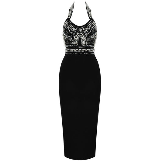 DOLLY High End V-Neck Sleeveless Halter Neck Pearl Body Hug Long Party Dress-CHARMAINE