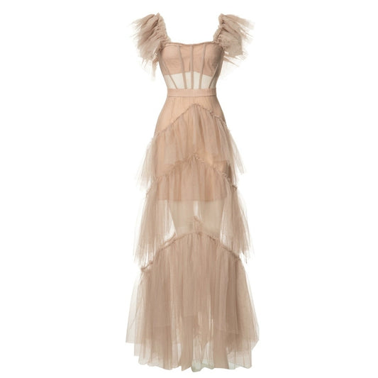 DOLLY High End Square Collar Short Ruffle Sleeves High Waist French Style Dress-MARIANA