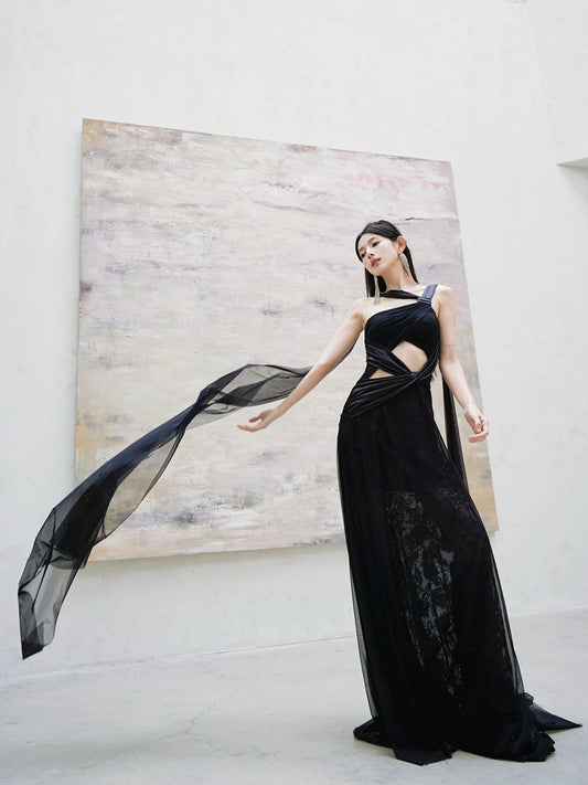 DOLLY Luxury Black Retro Chest Wrap Sleeveless Off Shoulder Long Dinner Dress-ALVINA
