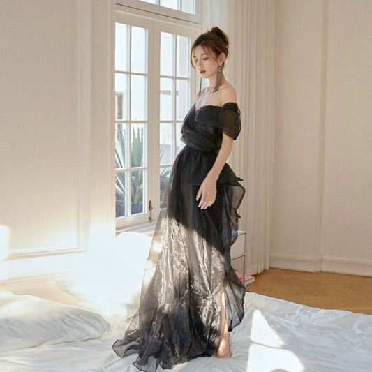 DOLLY Luxury Black Retro Style Off Shoulder Short Sleeve Long Banquet Dress-QUINNY