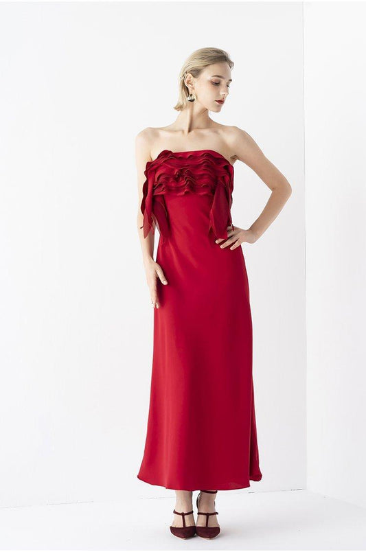 Elegant strapless Chest midi Red ruffle BriDal evening cocktail Dress - Bita