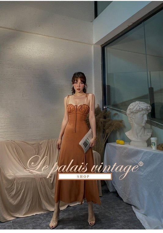 High-class elegant clay slit slip retro vintage bustier dress - WB