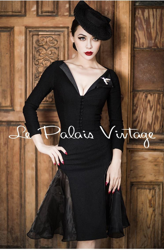 Le palais vintage drape satin pajamas lantern sleeve wrapped black lbd dress- Noph