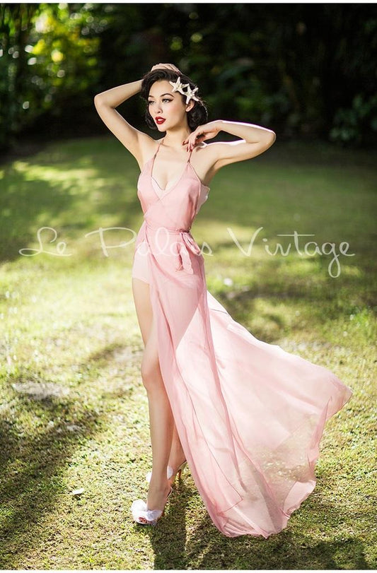 Vintage retro pinup 1950 Pink wrap around cover Maxi dress night gown- Goli