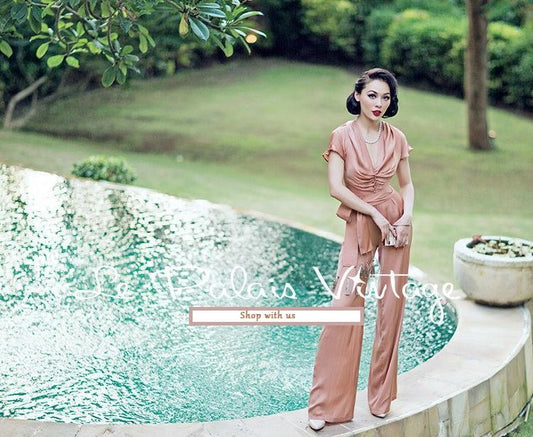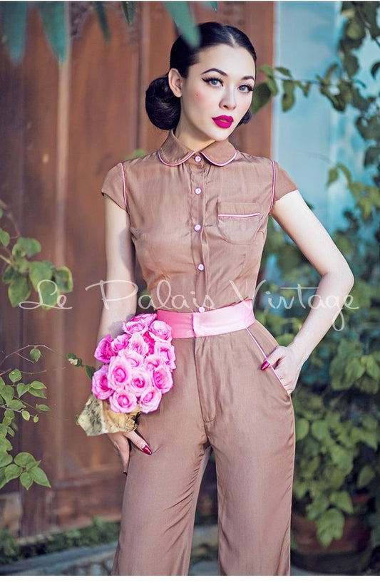 Vintage Retro pin up Silk Khaki brown Wide Leg pant Suit- Rela