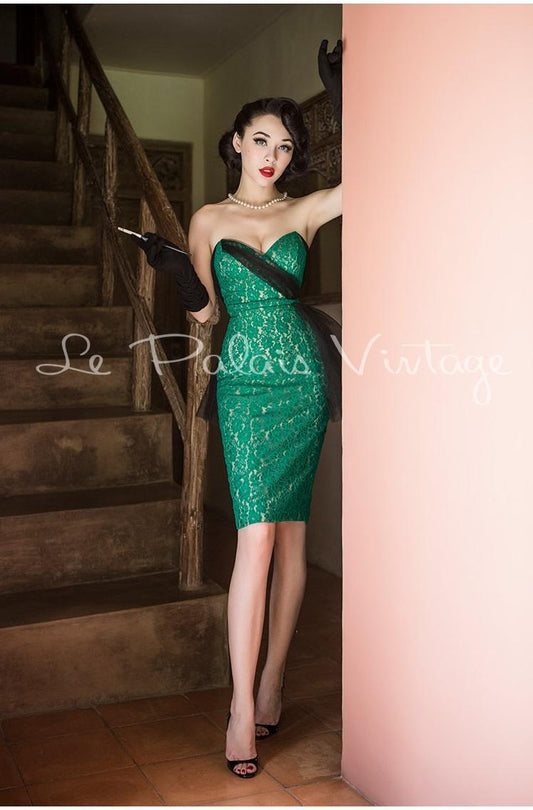 Elegant vintage retro pin up green sweetheart neckline fishbone lace dress - Tivli