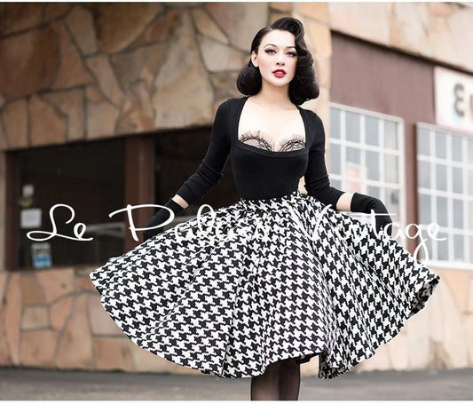 Vintage retro elegant black and white hound's-tooth high waist full skirt- Elia